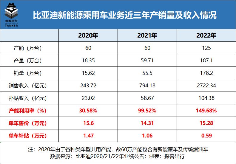 「探客出行」从比亚迪2022年业绩报发现,2022年比亚迪新能源乘用车产能达125万台,而销量却已经攀升到了178.20万台,产能利用率高达149.68%,可见在产能爬坡的2022年,比亚迪已经是在超负荷生产了。