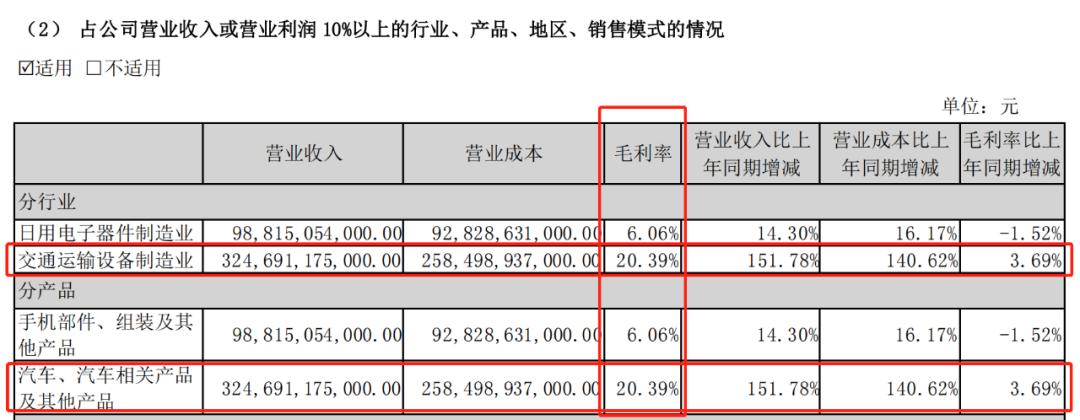 「探客出行」从比亚迪2022年报发现:按照行业划分,交通运输设备制造业 (按产品划分,汽车、汽车相关产品及其他产品) 实现营业收入3246.91亿元,占总营收的76.57%,毛利率达20.39%。
