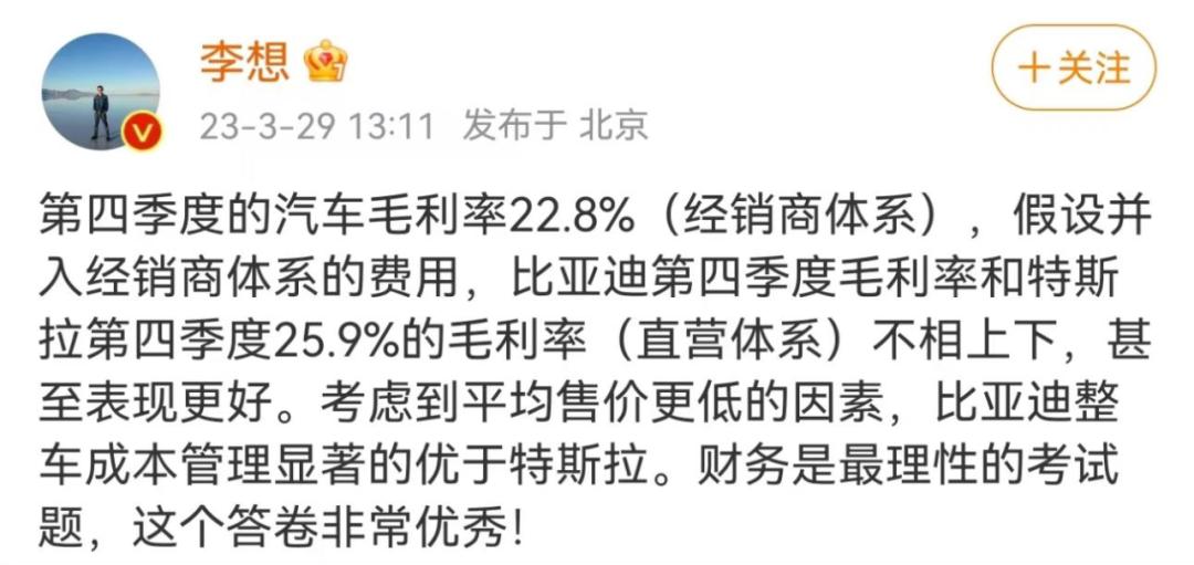 理想汽车创始人李想在3月29日的微博中毫不吝啬地为比亚迪的高毛利率点赞。李想认为,“在经销商体系下的比亚迪,第四季度22.8%的毛利率,甚至不低于直营体系下特斯拉25.9%的毛利率。”