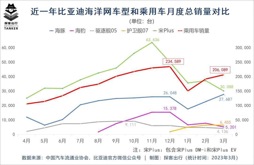 若是从近一年 (2022年4月-2023年3月) 销量数据来看,仅有售价在10到13万级的海豚车型,月销量变化能勉强达到同步比亚迪乘用车销量走势。