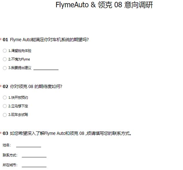 如果你现在打开魅族官网,首先映入眼帘的不是魅族手机,而是FlymeAuto &领克08意向调研。当你向下滑动页面时,才能看到前几天刚刚发布的魅族20系列。
