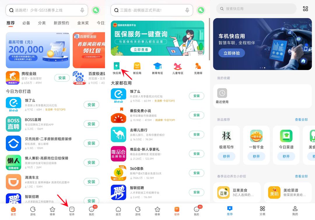 拿小米手机来举例好了,想要使用快应用的话,需要到小米应用商店的软件页面找到快应用,然后再点击图标进入快应用中心,选择自己想要的快应用。——这个过程一般需要 3 到 4 步操作,挺麻烦的。