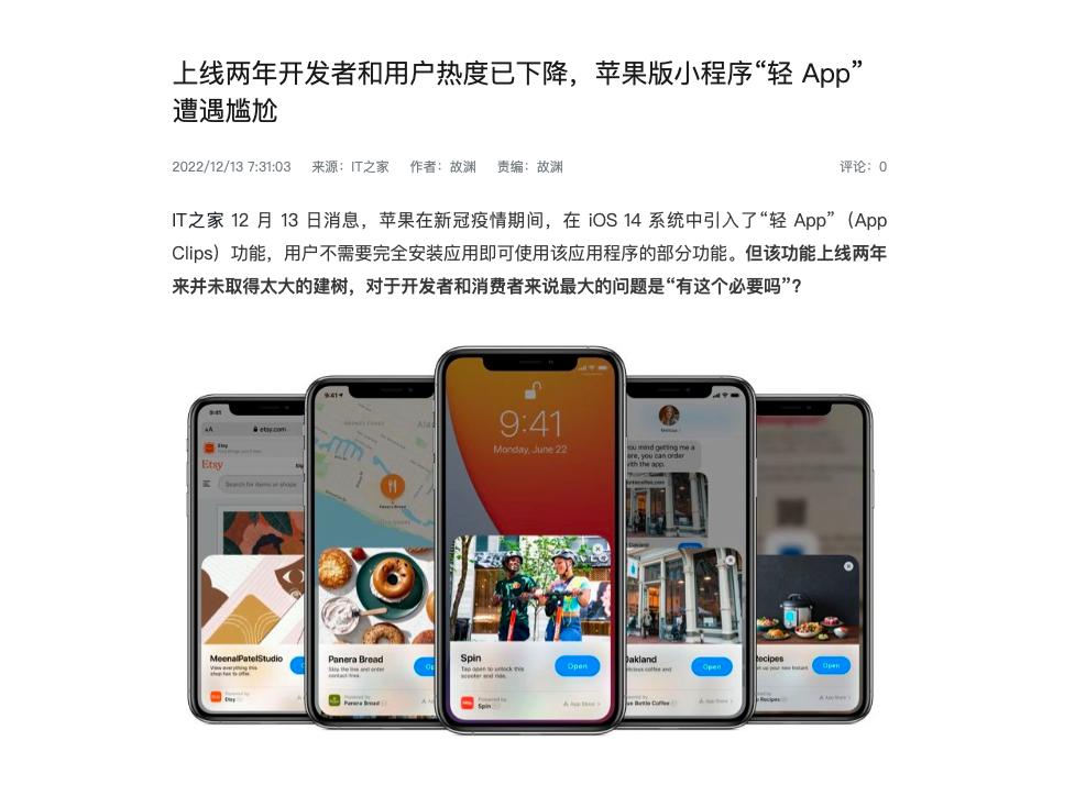 因为苹果打一开始就没给轻 APP 做入口,果子哥原本的设想是把轻 APP 跟线下场景结合起来,用到的时候可以快速打开,用完就立即关闭,主打的就是一个无感体验。