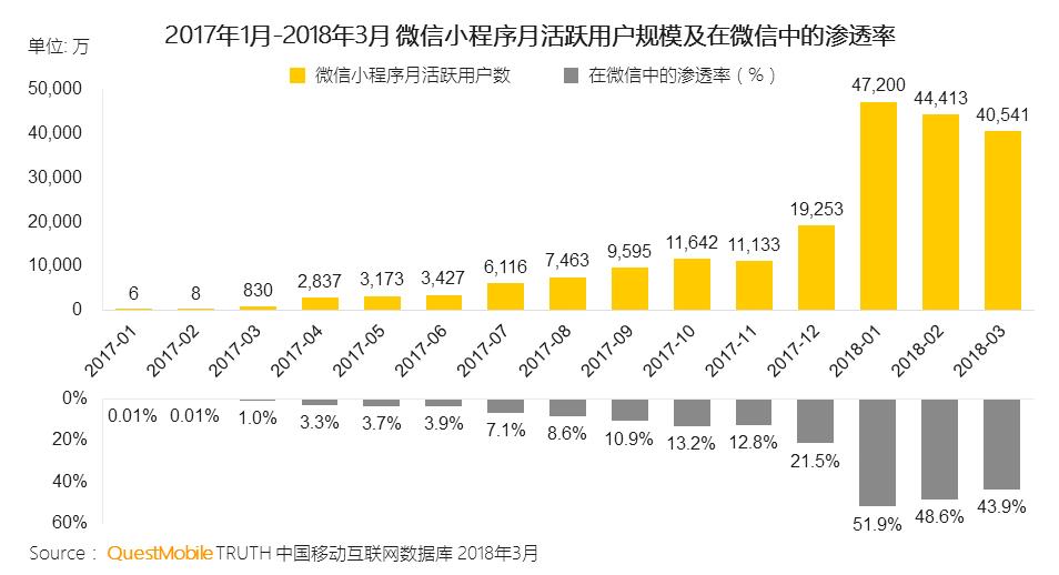数据显示,小程序于 2017 年底改版之后,在微信上的活跃度和渗透率有了非常明显的增长。