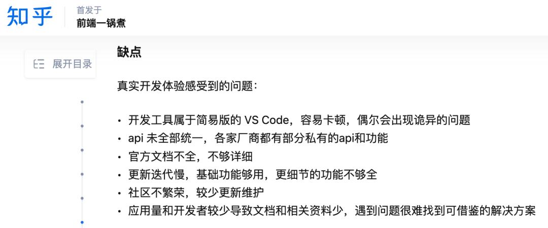 开发工具不太好用、 api 未全部统一、官方开发文档不全、社区不繁荣导致找不到可借鉴方案。。。这些问题都让开发者感到头疼。。。