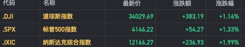 截至收盘,道指涨1.14%;纳指涨1.99%;标普500指数涨1.33%。