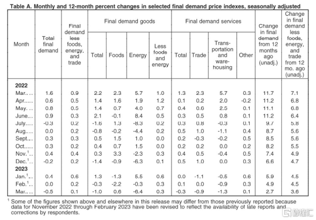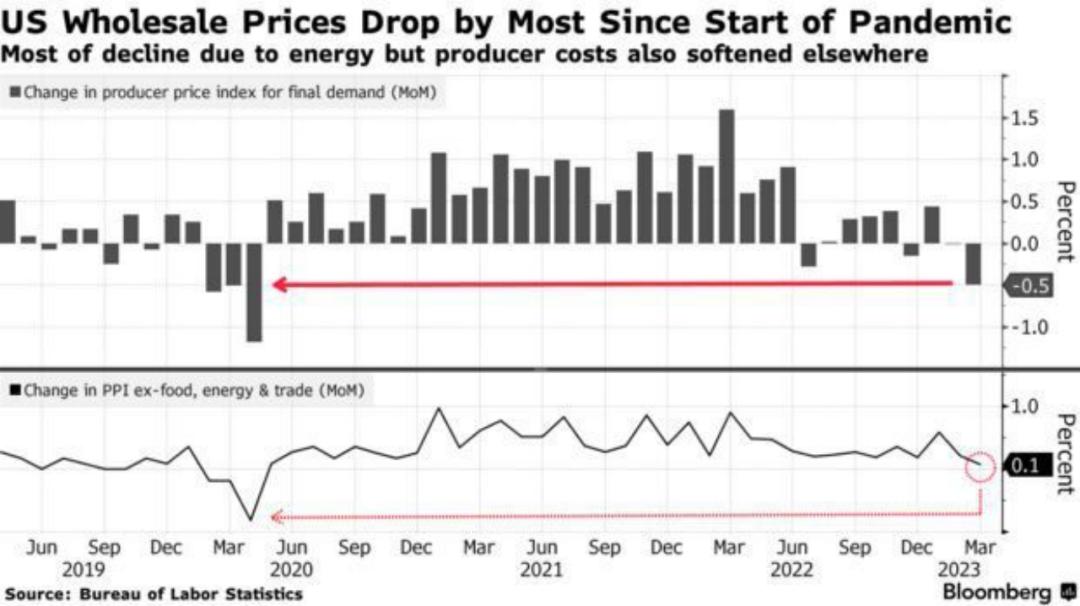 美国3月PPI的下降主要是由于能源价格下降推动。具体来看,商品价格继2月份下降0.3%后,3月份下降1%。3月服务业PPI下降0.3%,为2020年4月下降0.5%以来的最大降幅。