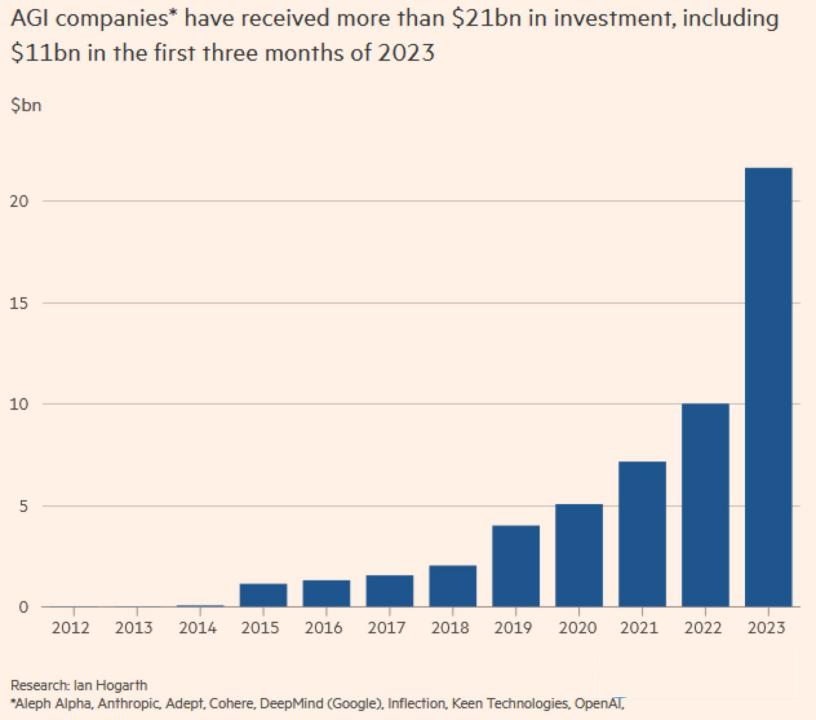 其实自去年11月ChatGPT普及以来,一大波资本和人才纷纷转向AGI研究。从2012年第一家AGI初创公司DeepMind获得2300万美元以来,目前8家公司2023年累计获得了超过210亿美元的投资。