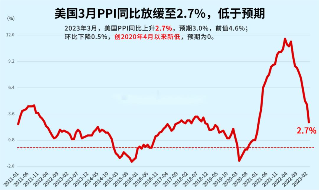 美国劳工部发布的数据显示,美国3月PPI同比增速为2.7%,不仅显著低于预期的3%,较前值4.6%也大幅下降,创下了2021年1月以来的最低增速;