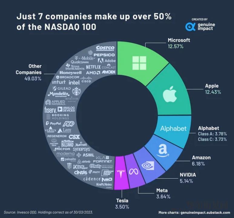 目前这七家公司在纳斯达克100指数中的占比合计达50%。微软(12.57%)、苹果(12.43%)谷歌母公司Alphabet (7.51%)、亚马逊(6.18%)、英伟达(5.14%)、Meta(3.64%)和特斯拉(3.5%) 。