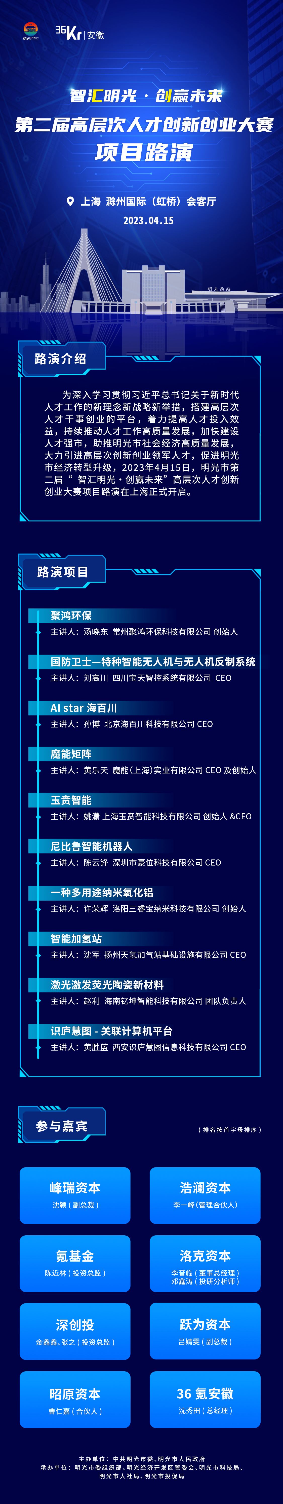 路演由峰瑞资本、浩澜资本、氪基金、洛克资本、深创投、跃为资本、昭原资本、36氪安徽等机构的专家导师组成路演评委团,按照商业模式+现场表现推选出晋级决赛项目。此外,其余项目将在4月17日、18日通过路演完成晋级。