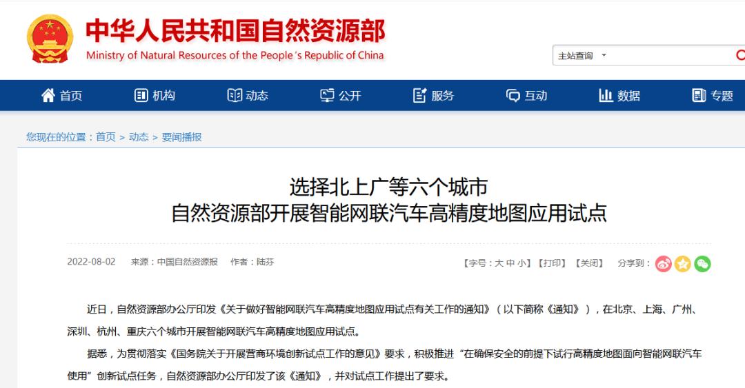 另一方面,国家针对高精地图的专项支持政策也在逐渐落地。 去年8月,国家自然资源部发布了《关于做好智能网联汽车高精度地图应用试点有关工作的通知》,并选择了北上广深等6座城市作为试点城市。