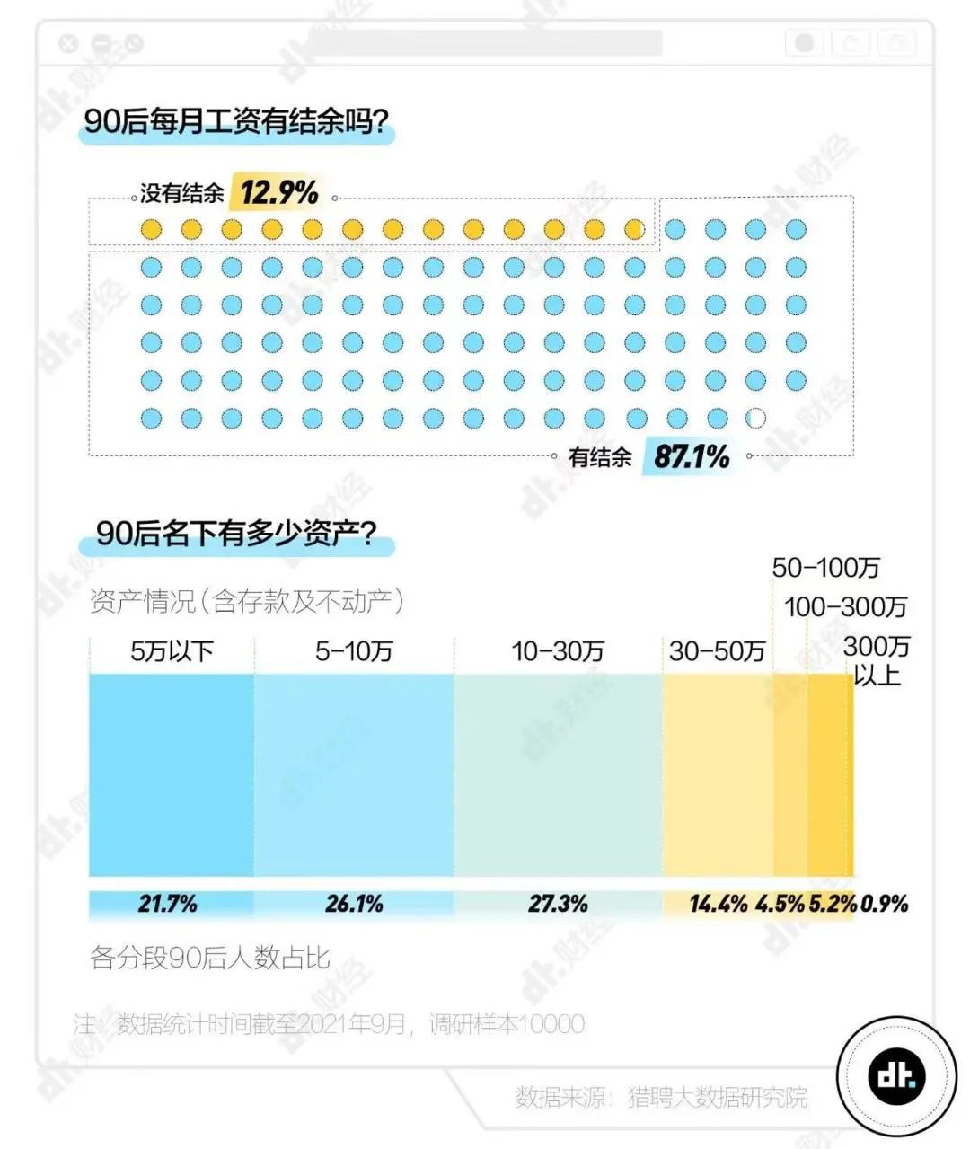 根据DT财经发布的报告显示,截止2021年9月,90后中高端人才存款集中在5万到30万之间,且87.1%的人月工资有结余,这些中高端人才也主要集中于北上广深等一线城市。