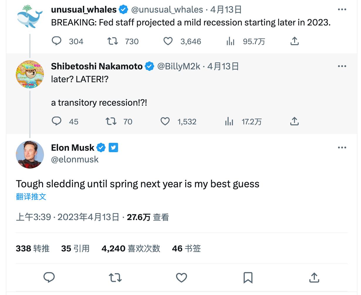 这是马斯克对另外一条推文的回应,该推文称,在3月初硅谷银行和签名银行倒闭后,美联储自己的经济学家正在为今年的温和衰退做准备。