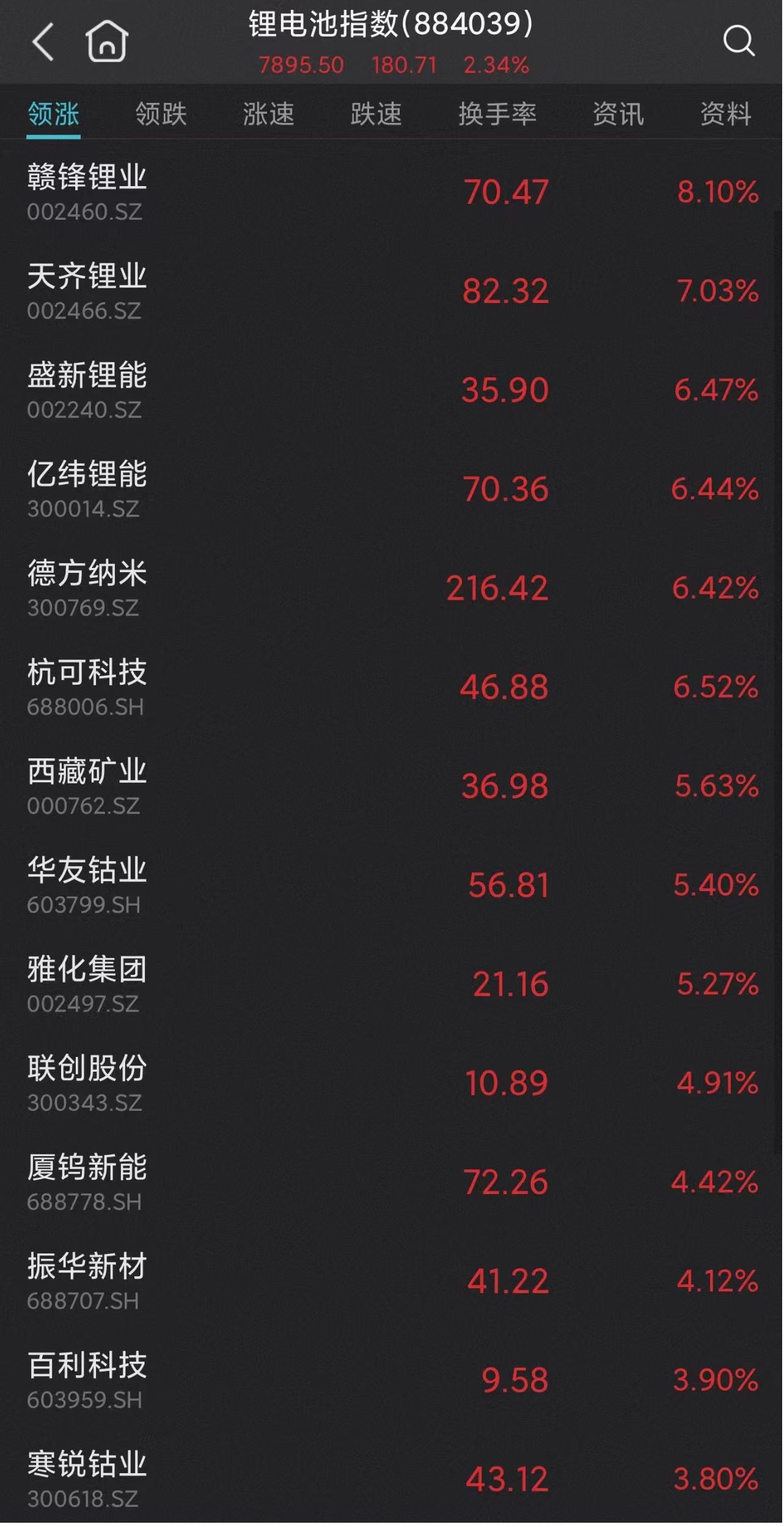 锂电池板块持续拉升,永兴材料封涨停,中矿资源、赣锋锂业大涨8%,天齐锂业涨超7%,久吾高科、盛新锂能、亿纬锂能、德方纳米、杭可科技等多股涨超6%,宁德时代涨超3%。