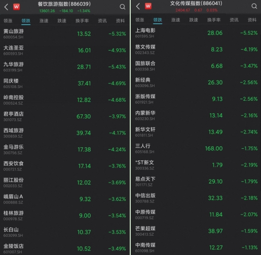 昨日尾盘爆发的旅游板块以及此前火热的传媒板块,今日上午的资金情绪则有所撤退。旅游板块方面,黄山旅游跌超5%,岭南控股、君庭酒店等跟跌。传媒板块,上海电影跌超5%,慈文传媒、三人行等跌幅居前。