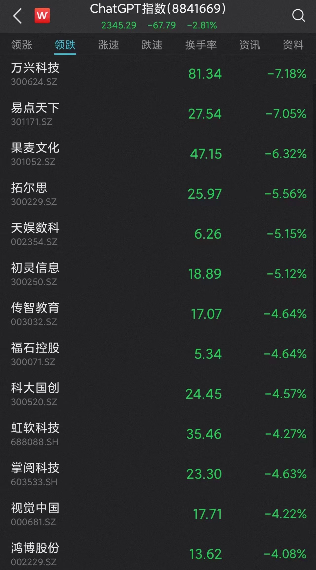 ChatGPT概念股今日走低,“8天6板”的奥飞娱乐触及跌停,万兴科技、易点天下跌超7%,蓝色光标、开普云、拓尔思、天娱数科等多股跌超5%