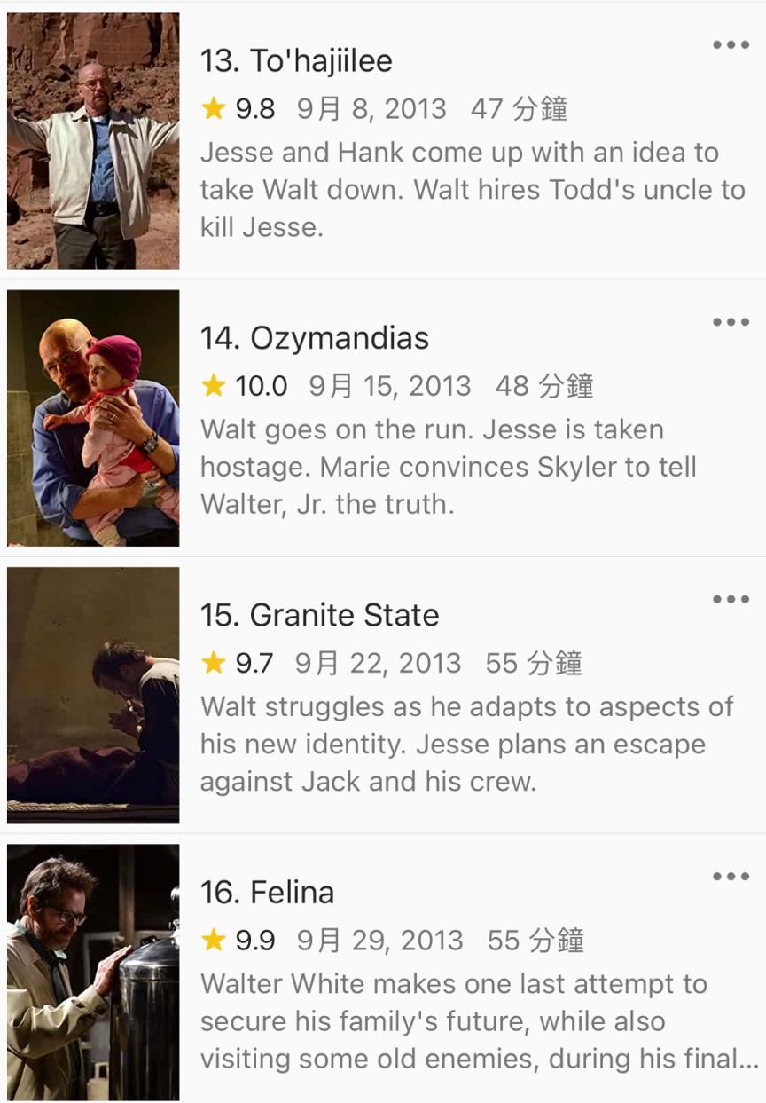 在此之前,也有一部剧的单集分数在IMDB上拿到了满分,那就是《绝命毒师》第五季的第14集《Ozymandias》(人生如诗)。而这部剧最终季的第13集《To'hajiilee》(藏金之地)、第15集《Granite State》(王的复仇)、第16集《Felina)》(曲终人散)也都接近满分。