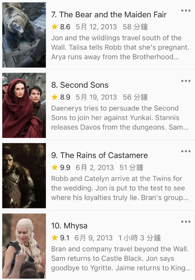 如:《权力的游戏》第三季第9集《The Rains of Castamere》评分高达9.9分,这一集发生了有名的“血色婚姻”惨案。
