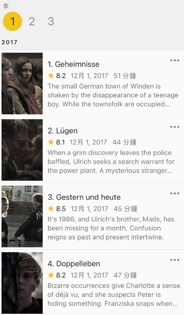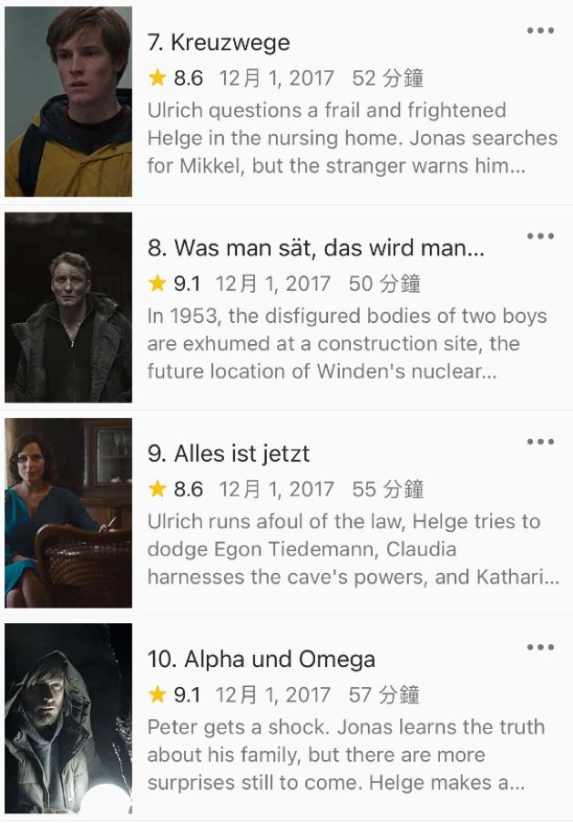 《暗黑》由德国主创打造,德意志是哲学的民族,德国人重视逻辑。《暗黑》这样的“莫比乌斯环”叙事,前期的铺垫比较慢热枯燥(台剧《想见你》前面也比较慢热),到后面“解惑”时则一集比一集好看,《暗黑》在IMDB上的评分曲线也体现了“莫比乌斯环”叙事的观众反馈特点。难得是《暗黑》第二季、第三季继续“挖坑”的同时还能继续“填坑”,这对长篇叙事来讲十分考验主创功底。