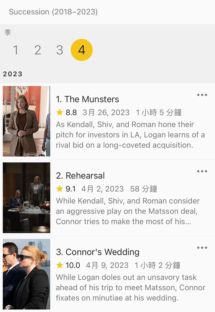 近日播出的《继承之战》第四季第3集《Connor’sWedding》(康纳的婚礼)在IMDB的评分为10分(满分),成为了现代电视剧史上最好的单集之一。
