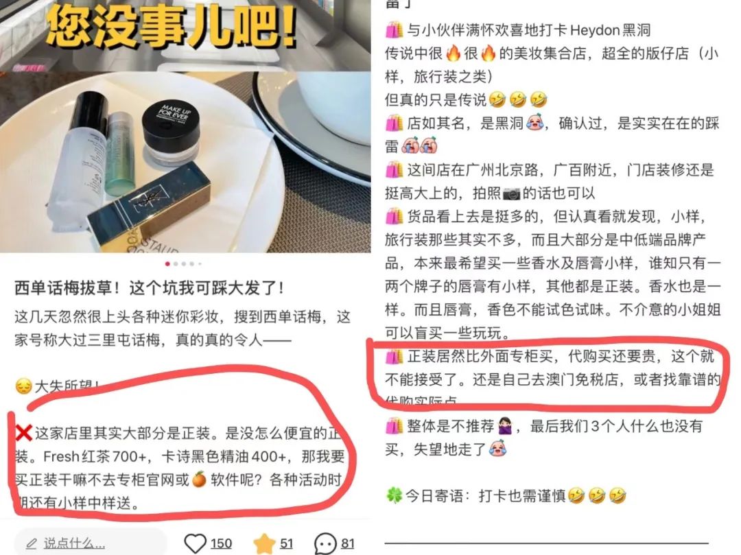 而这条点赞量上百的笔记下,也有不少网友表示相似的观点,“有的比品牌的官方旗舰店价格还贵,我去了一次就再也不去了”、“刚开业时还有不少小样,现在小样越来越少,但买正装,一样的价格我去专柜不香吗?”、“第一次去买了资生堂红腰子精华小样,10ml要100块,回来以后看天猫U选,只要50元”……