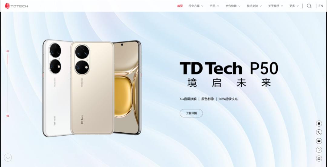 在鼎桥的官网上,目前的主力产品是智能手机TD Tech P50和TD Tech M40,这两款手机在设计上与华为的旗舰产品产品Mate系列和P系列有着像素级的相似,就连命名上都有些暧昧意味,TD Tech P50听起来就像华为P50的TD版。