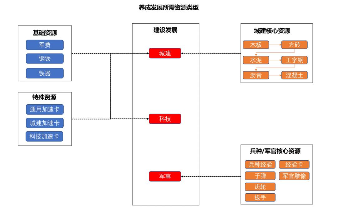 值得提出的是,不同养成部分所需的资源类型有所不同。资源类型包括可大量获取的基础资源、加速卡等特殊资源、养成部分中专属的核心资源(例如:城建的建材资源,军事的兵种经验等)。