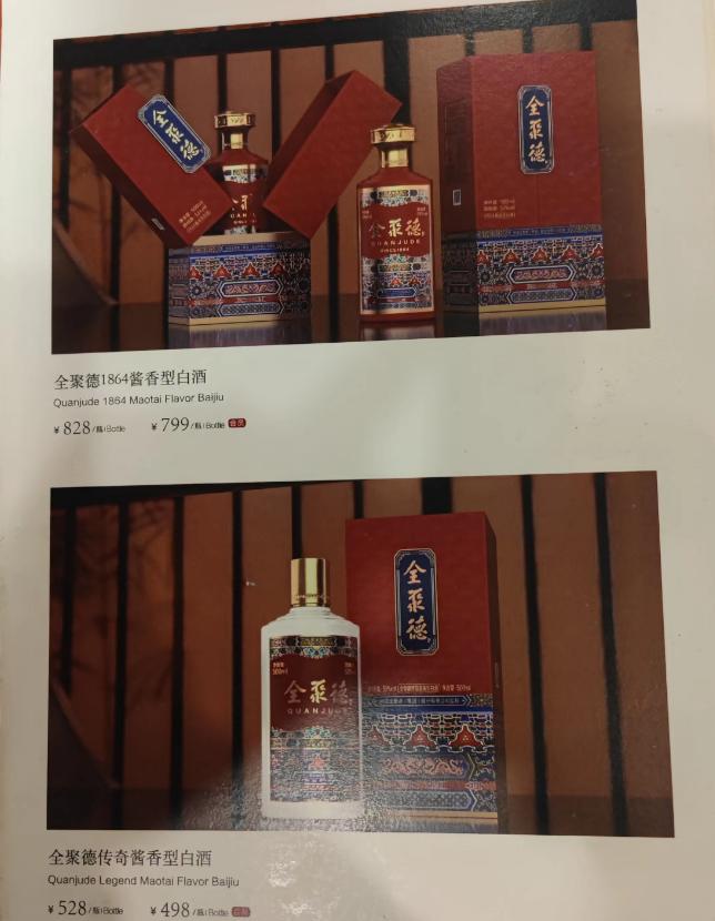 4月11日,「市界」探访全聚德前门店时,翻开全聚德红色封面的菜单发现,最先出现的商品并不是全聚德最具特色的烤鸭,而是两款酱香型白酒——在同一页,上面是全聚德1864,售价828元/瓶;下面是全聚德传奇,售价为528元/瓶。