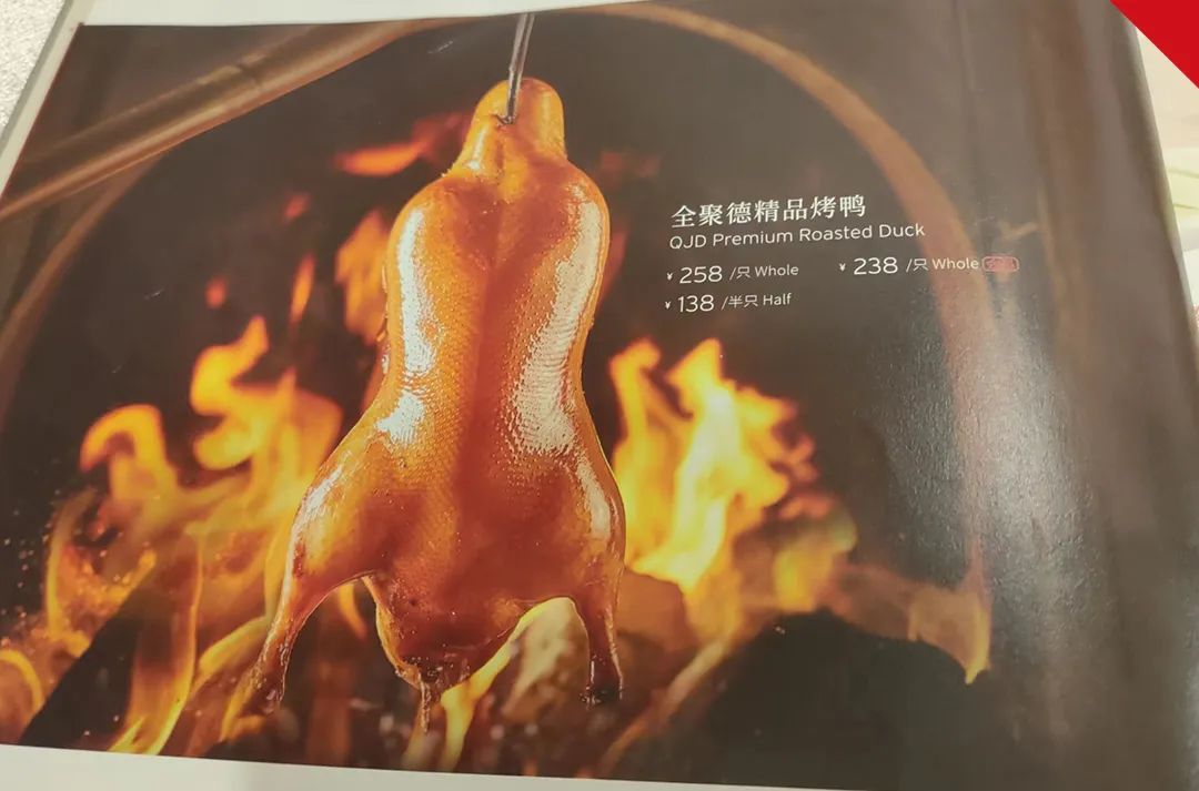 翻开菜单,一只全聚德普通的烤鸭258元,小料和饼需要额外点,小料一份5元,荷叶饼一屉15元……