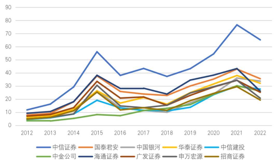 与十年前(即2012年)相比,资产规模排名前十的券商变化并不大,有八家保持不变。十年前在这项排名中居于前十的国信证券、光大证券已出局,取而代之的是中信建投与中金公司。