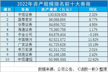 中信建投以最后一名挤入了前十。中信建投在2022年实现了资产规模5099.55亿元,同比增加了12.62%,增长比例居前。