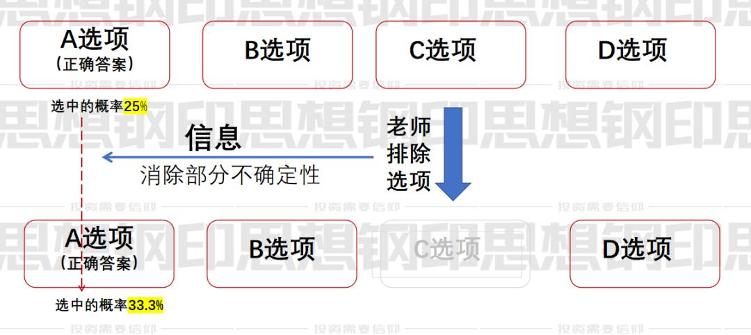 比如说,你被一条选择题难住了,此时,有同学直接告诉你,他选的是A,而老师只是告诉你,C是不对的——谁给的信息量大?