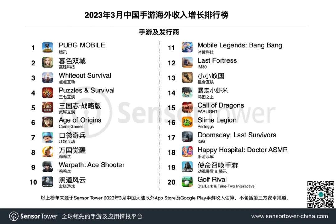 日前(4月13日),Sensor Tower发布了2023年3月中国手游在海外市场收入TOP30榜单(下称收入TOP30)。