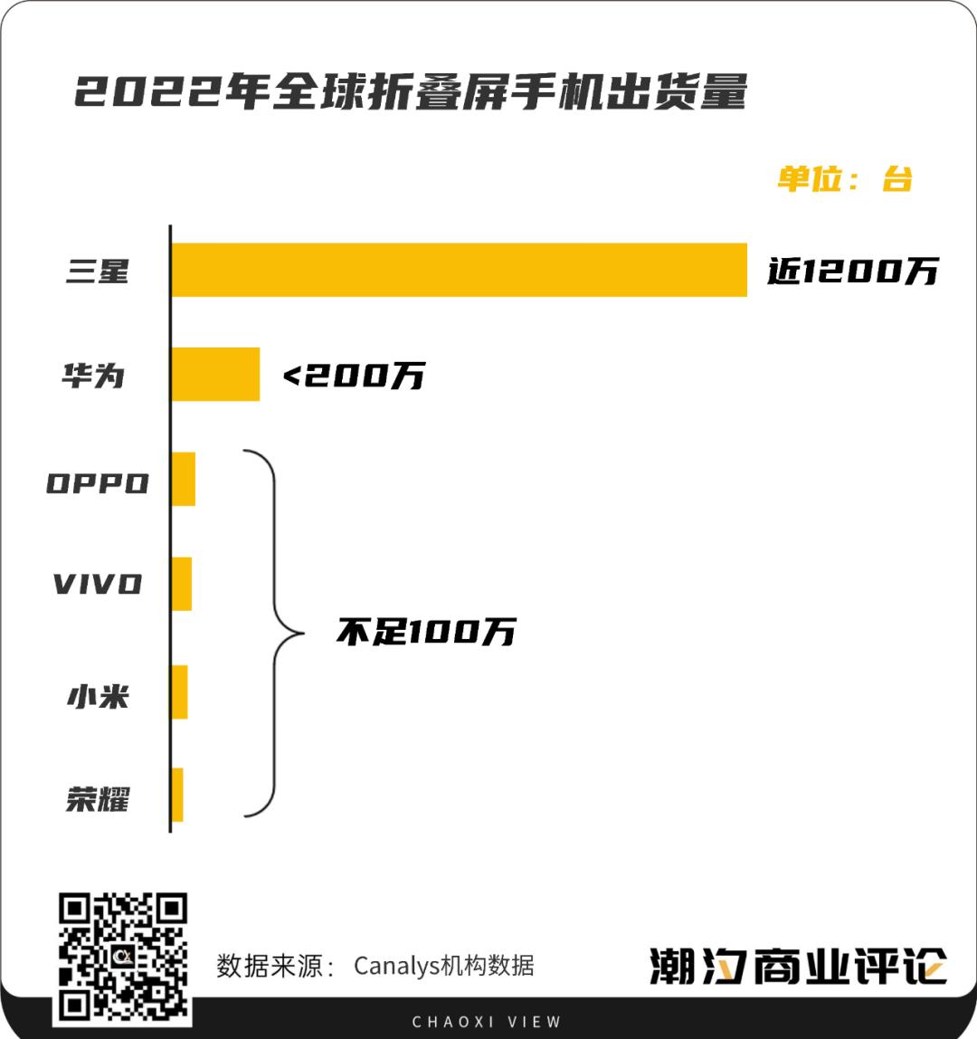 虽拿到了高端局的入场券,但想要站稳脚跟或许并不容易。Canalys数据显示,可折叠手机在2022年的出货量为1420万台,其中三星的出货量接近1200万台。华为排名第二,出货量不到200万台,而OPPO、vivo、小米和荣耀在2022年的出货量不足100万台。