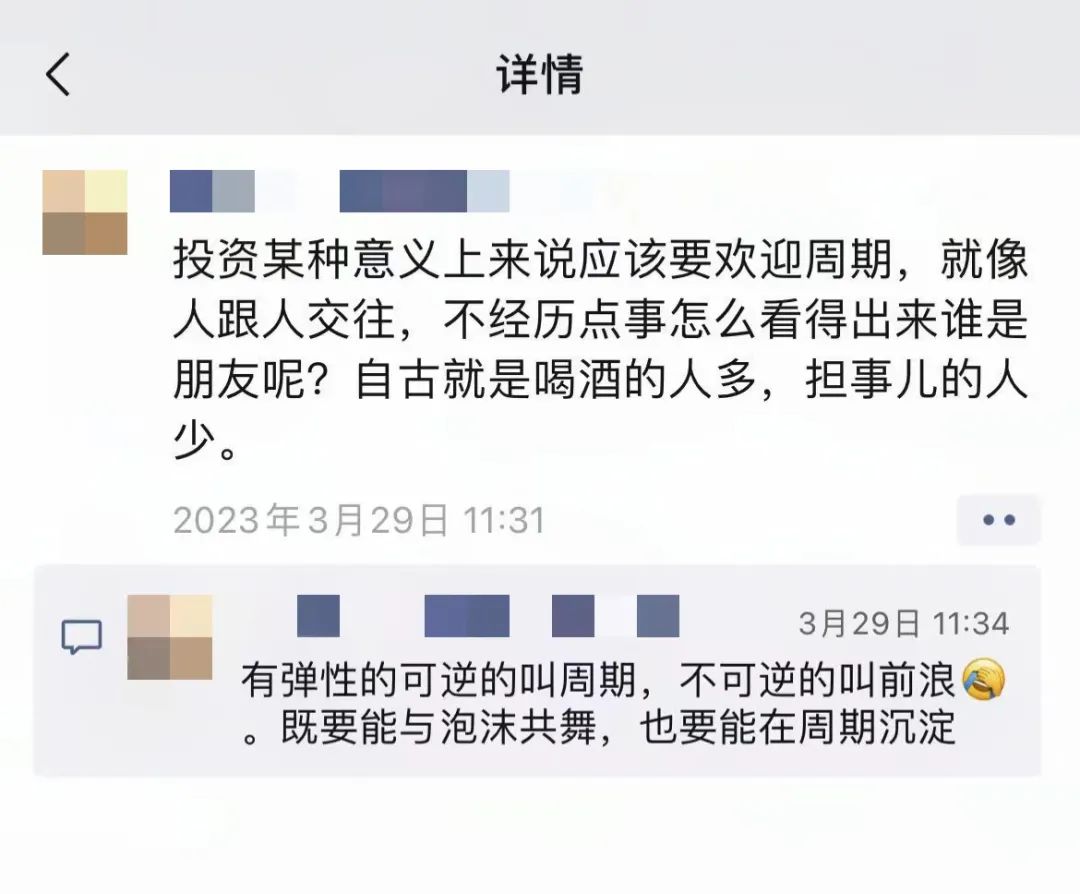 而入圈时间更久,经历过资本市场较多周期变化的人,却有另一番思考:“投资某种意义上来说应该要欢迎周期,就像人跟人交往,不经历点事怎么能看得出来谁是朋友呢?自古就是喝酒的人多,担事儿的人少。”这位FA机构的合伙人认为: 有弹性的可逆的叫周期,不可逆的叫前浪,既要与泡沫共舞,也要能在周期沉淀。
