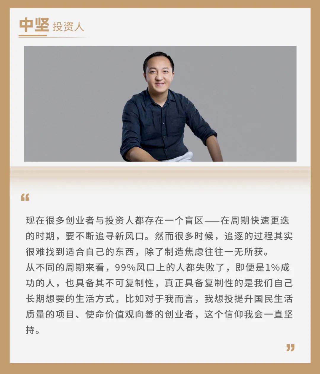 那对于我们每个人而言,可复制的是自己长期想要的生活方式, 比如对于我而言,我想投提升国民生活质量的项目、使命价值观向善的创业者,这个信仰我会一直坚持。在这个内核之下再去看商业世界,我就不会因为刺激而变化或焦虑,外界的变化大概率不会影响我的商业判断。