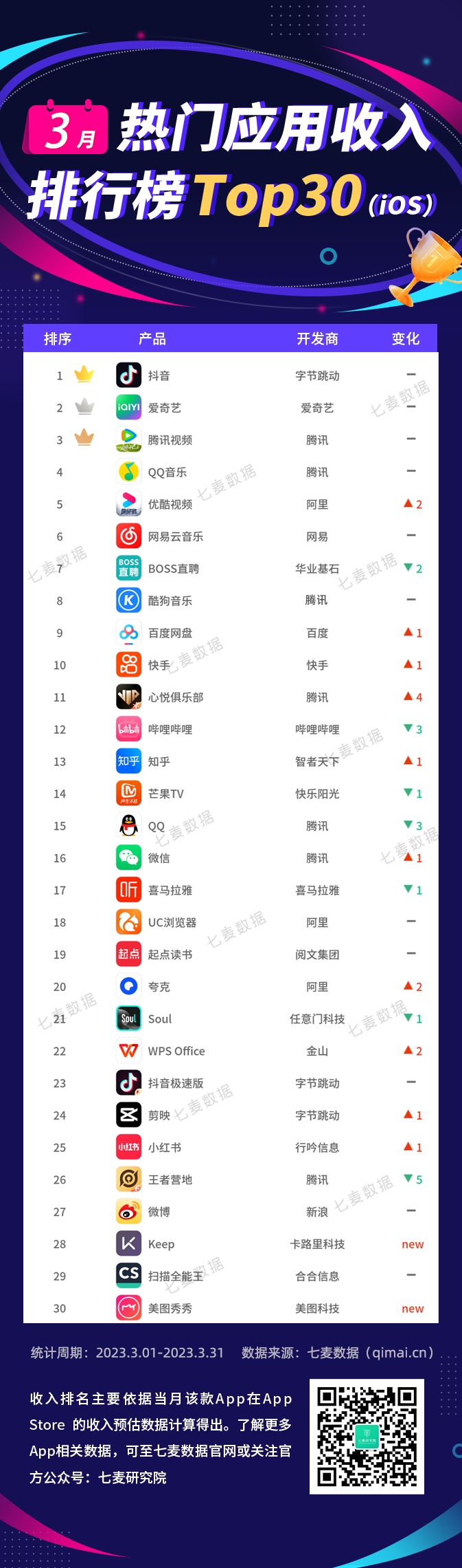 近日,七麦数据发布 2023 年 3 月热门应用排行榜,包含应用下载榜和收入榜。