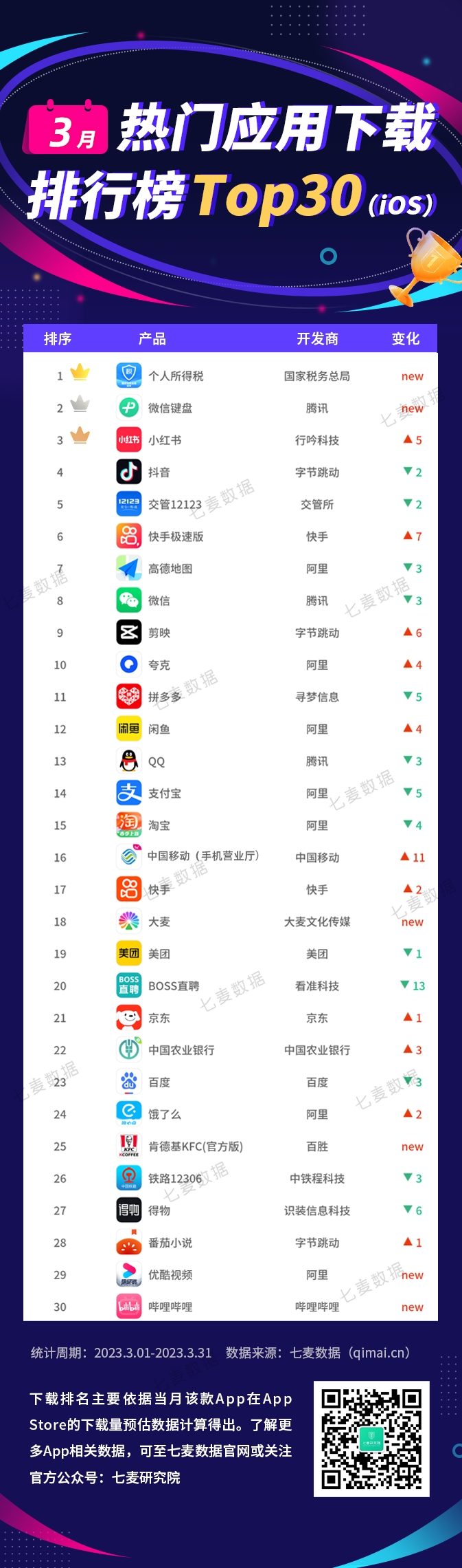 3 月热门应用下载榜 Top30 中,共有 6 款新进榜应用。值得一提的是:随着2022年度个人所得税综合所得汇算清缴事项的开启,“你退税了吗?”成为讨论的话题,国家税务总局旗下的「个人所得税」本月下载量飙升,成功占据下载榜 Top1 的位置。