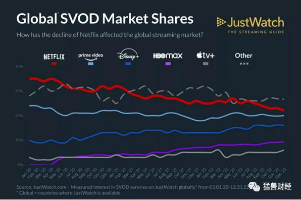 经过多年的竞争,Netflix在这个行业市场份额已经大幅下降。据Just Watch的研究报告,截至2022年12月,Netflix仍然是这个行业市场份额最大的公司,但亚马逊的Prime Video和迪士尼的Disney+市场份额已经非常接近Netflix了,而且这两家公司还在继续在各自的平台和内容上进行大举投资。此外,迪士尼还将推出广告服务,这将有助于增加其订阅用户数量。另一方面,亚马逊还在继续向亚马逊Prime Video投入资金,该公司将在2022年向原创、体育直播和授权等内容投资70亿美元。