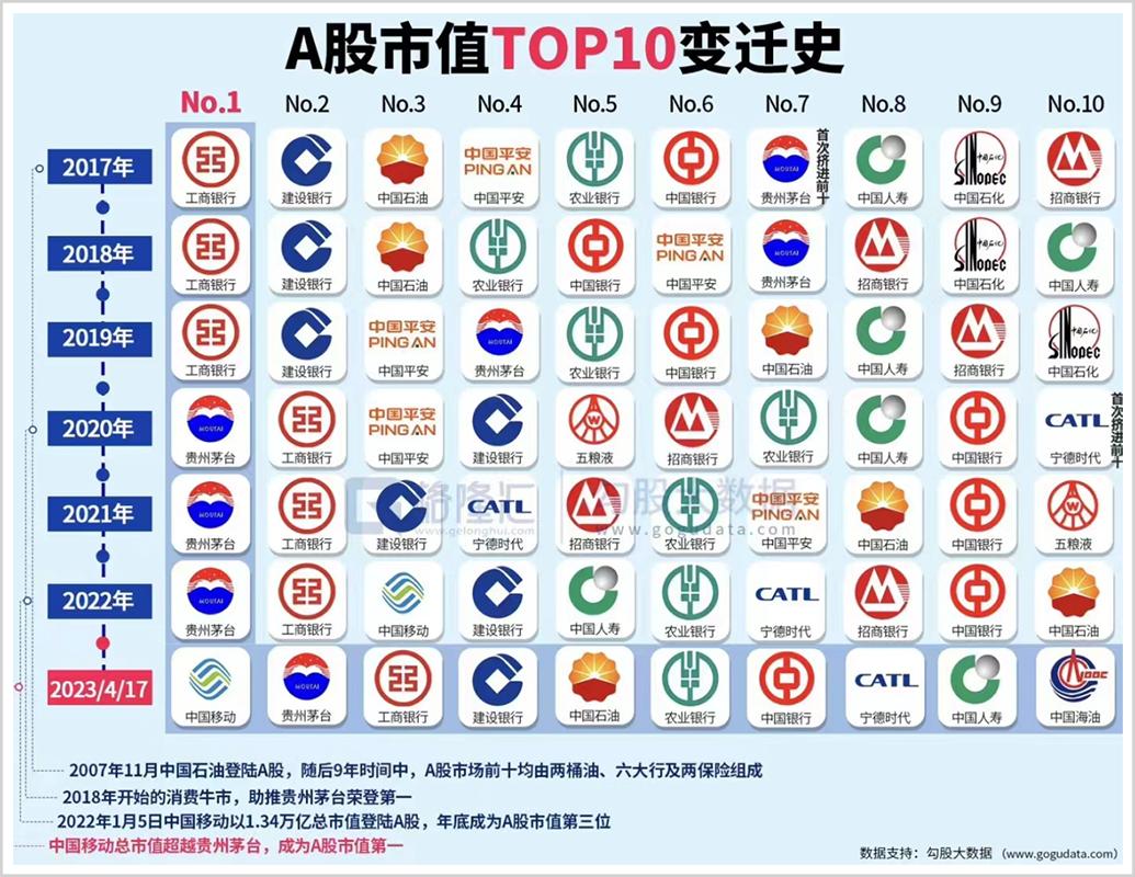 4月17日,中字头股票再次成为引领大盘上涨的主要力量,其中中国移动盘中大涨4%,股价创出历史新高,市值一度超越贵州茅台,成为A股总市值最高的上市公司。雄踞A股市值榜首近3年的中国酒王,终于被拉下神坛。
