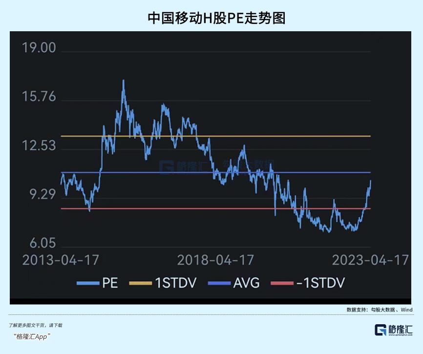 当然,中国移动上涨这么多,更多来源于估值的大幅提升。年初,PE-TTM为12.05倍,到目前为止已经攀升至17.5倍。看港股,最新估值为9.78倍,仍然位列最近10年来估值中位数以下。