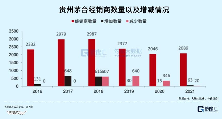 2018-2022年,茅台国内经销商数量从2987个缩减至2084个,累计减少了903家。看似少了很多,但这里面减少的绝大多数均是茅台系列酒经销商,而茅台酒经销商变化并不大。这块经销商大蛋糕依旧没有撬动。