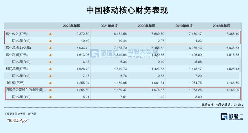 2021-2022年,中国移动业绩有所改善。去年,营收9373亿元,同比增长10.5%,归母净利润为1255亿元,同比增长8.2%。