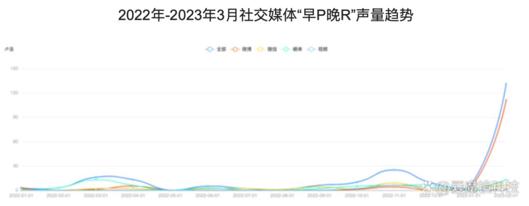 根据魔镜电商聆听数据,从2023年2月至今,各大互联网平台上关于早P晚R的讨论在2023年2月达到顶峰,而关于早C晚A的讨论在2022年3月之后便热度退却。