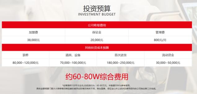官网给出的资金预算显示,公司收取加盟费3.8万元、保证金2万元及管理费用800元/月,其余费用包括装修、道具设备、首次进货及流动资金,综合费用约60万元-80万元。
