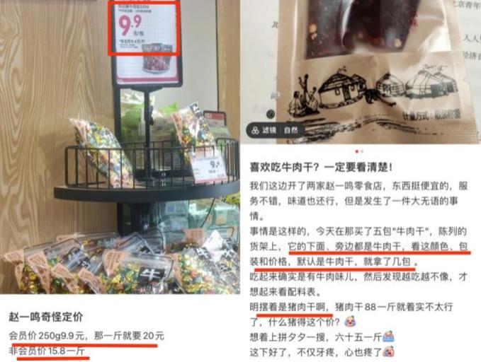 例如有消费者在网上吐槽,一款产品会员价格为9.9元/包(一包250g),非会员价格为15.8元/斤。若以会员价格购买一斤(2包),则需19.8元,比非会员价高出4元;赵一鸣零食某门店利用商品陈列“套路”消费者,将猪肉干放在牛肉干商品附近,并以远高于电商平台的价格卖出。