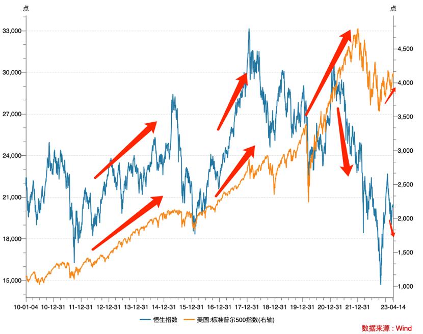 上图为2010年至今恒生指数与标普500的走势情况,可以清楚看到在大多数时间内两大指数走势的一致性,但在2020年至今两条折线的表现乃是相当凌乱。