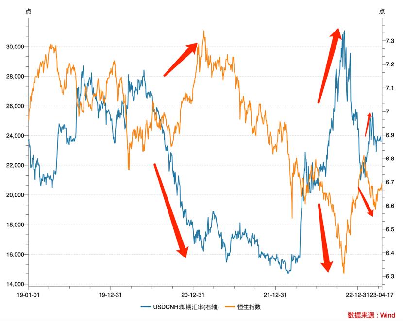 在上图中我们亦看到2022年末之后,港股有一轮非常强劲的反弹,这主要是对未来经济强复苏预期的影响,将预期与汇市以及资本市场捆绑,形成如下反应链条:经济复苏预期高——利率市场走强——人民币升值潜力显现——汇市卖外币买入人民币——香港市场流动性充裕——资本市场大利好。