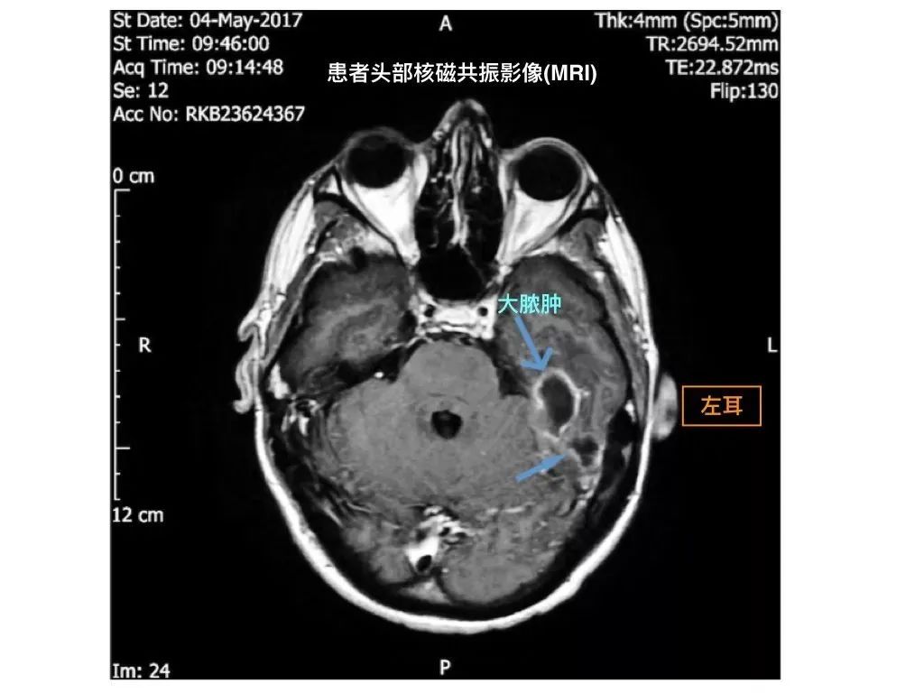 医生们给他做了一个头部的核磁共振,发现天呐,小伙儿脑子里有脓肿,大的脓肿有2.9x1.7x0.9cm^3,大概一枚葡萄那么大,外耳道里还充满着软组织密度影,原来是坏死性外耳道炎侵犯了颅脑。他的癫痫发作和暂时记忆丧失,可能是因为脓肿压迫了大脑。